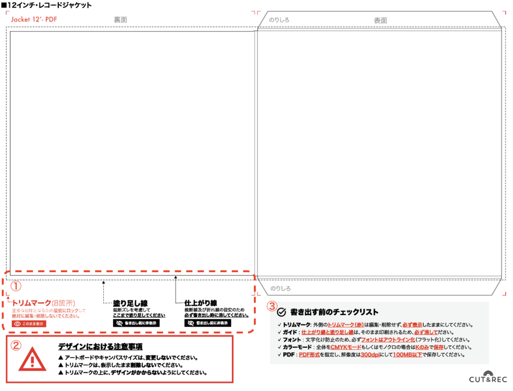 必要な文字やデザインは実線内におさめてください。実線外の文字やデザインは仕上がりに反映されません。PDFファイルに書き出す際は必ず非表示にしてください。