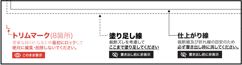 仕上がり線と塗り足し線は、そのまま印刷されるため、必ず消してください。